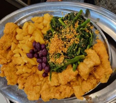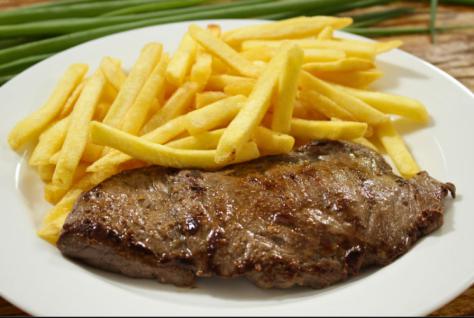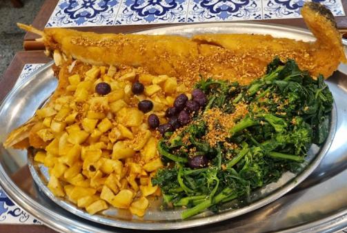 Posta de bacalhau frito em alho e óleo, guarnecido com brócolis ou batatas coradas.