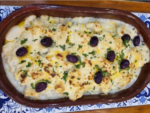 Pedaços de bacalhau sem pele, batata, manteiga, alho, cebola picada. Todo no molho branco com natas, queijo ralado gratinado no forno, azeitonas e salsinha.