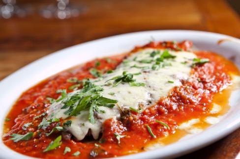 Filé de bacalhau, empanado ao molho de tomate e camarão com cobertura de mussarela, alho e azeitonas.