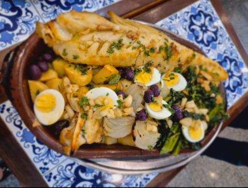 Pedaços do lombo do bacalhau ao molho de tomate, grão de bico, pimentão, ovo cozido, azeitonas e batata