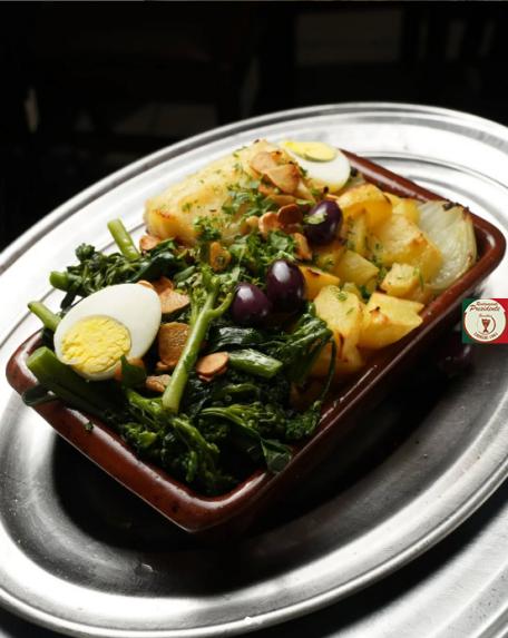 Posta de bacalhau frito em alho e óleo, guarnecido com brócolis ou batatas coradas.