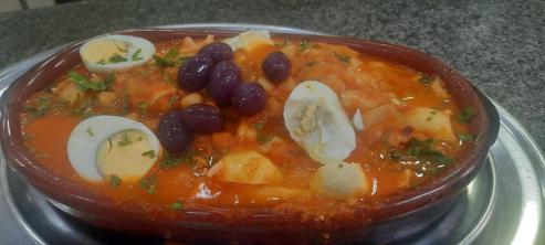 Pedaços do lombo do bacalhau ao molho de tomate, grão de bico, pimentão, ovo cozido, azeitonas e batata
